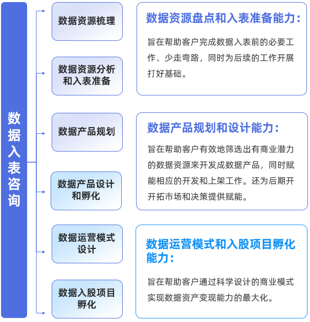 分阶段有重点地推进企业数据资源盘点和入表准备、数据产品规划和设计、数据运营模式和入股项目孵化三大能力建设,帮助企业实现敏捷高效的数据资源盘点,围绕企业需求定制科学合理的数据产品规划与运营模式,助力企业实现数据资产变现能力最大化。