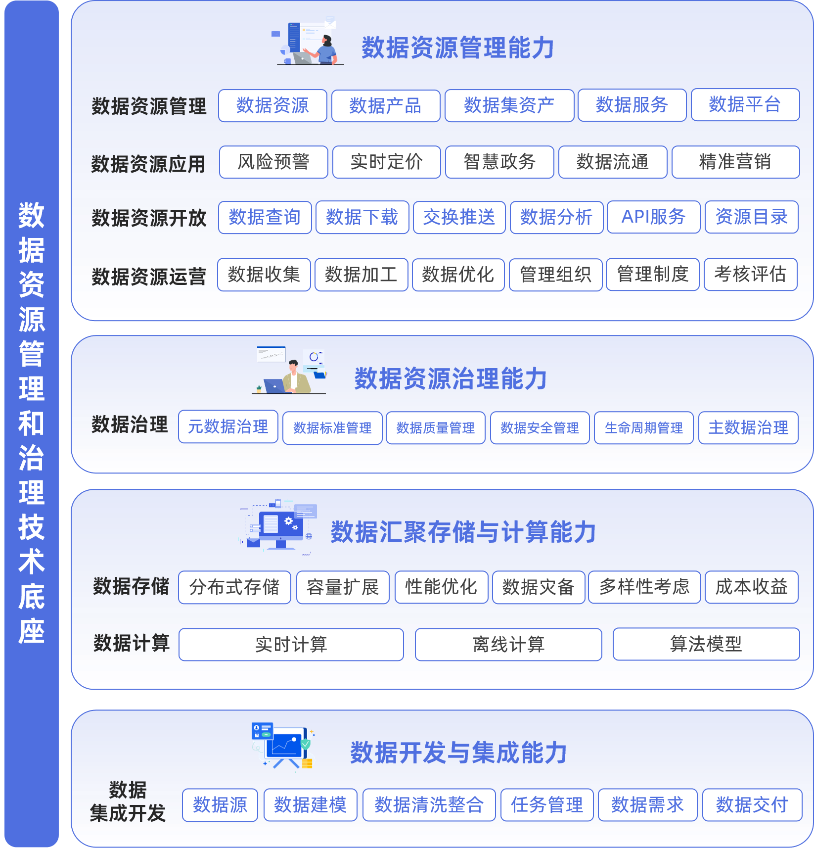 构建一个坚实的数据资源管理和治理技术底座是数据入表的关键。该底座分为4个领域:数据资源管理能力、数据资源治理能力、数据汇聚存储与计算能力、数据开发与集成能力。