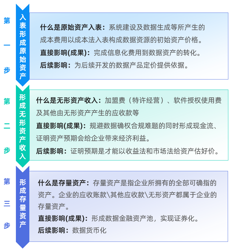 数据资产到底如何入表,可以拆解为三步,第一步是入表形成原始资产,第二步是形成无形资产收入,第三步是形成存量资产。